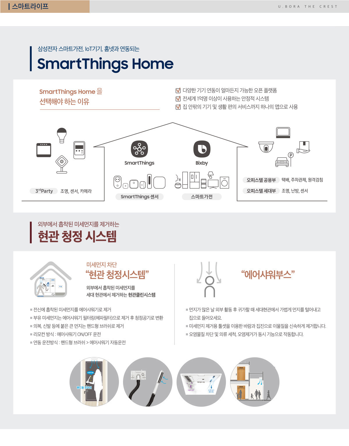 ※ 스마트폰 어플리케이션에서 세대 내 설치된 조명, 난방, 가스밸브 및 무인택배 등의 상태 조회 및 제어가 가능하며, 공기청정기, 에어컨 등 loT 호환이 되는 가전기기까지 제어할 수 있는 기능을 갖추었습니다. (기본으로 제공되는 세대 내 홈네트워크 연동기기(네트워크스위치-조명, 난방제어 등) 외 스마트 가전제품 (공기청정기, 가습기 등)은 소비자가 별도로 구매해야 하며, 반드시 삼성전자 SmartThings Home 서비스와 호횐되는 모델이어야 함)